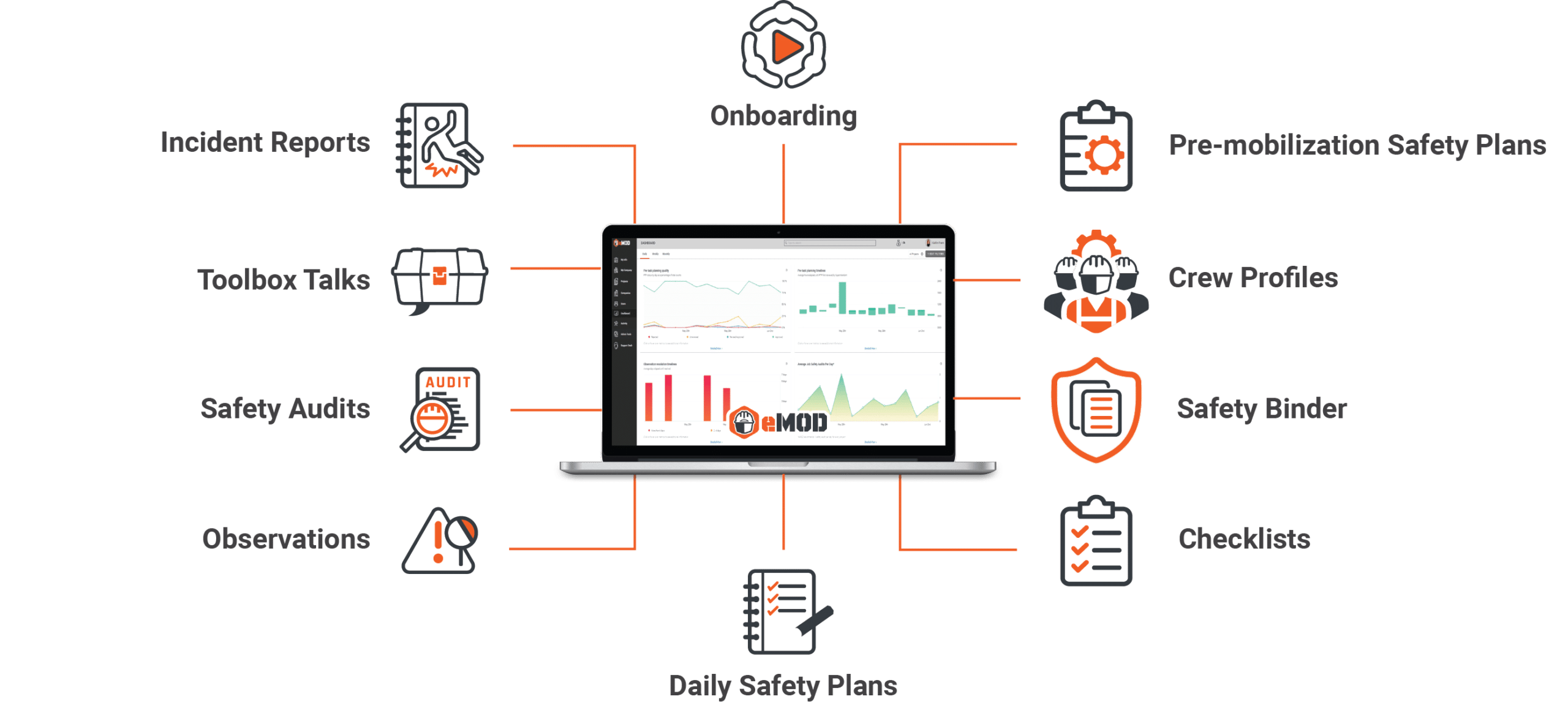 eMOD offers the construction industry a complete construction safety app. No more paper, safety documents are stored in the cloud, providing real time access with your personalized dashboard.